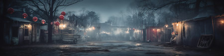 Nighttime abandoned amusement park with sanatorium, ferris wheel, and foggy park. Background concept for Halloween.