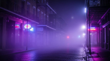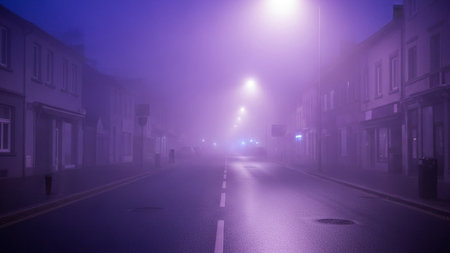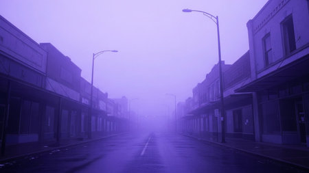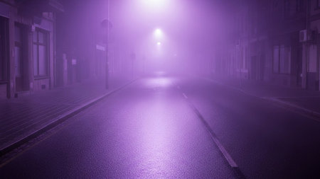 An empty street at night is enveloped in thick purple fog, with streetlights casting an eerie glow on buildings and...