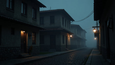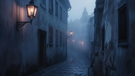 Misty evening stroll through a narrow cobblestone alleyway in a quaint historic town