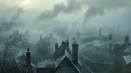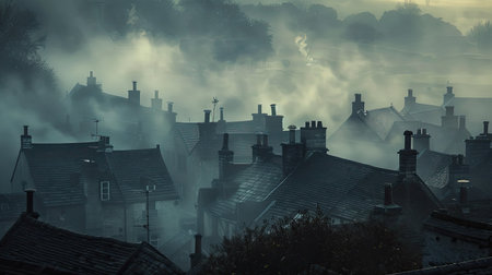 A dense fog enveloping a quiet village, with only rooftops and chimneys visible.