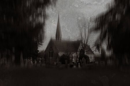 A spooky church and graveyard. With a digital paint effect. With a grunge, textured edit.