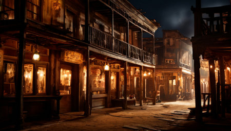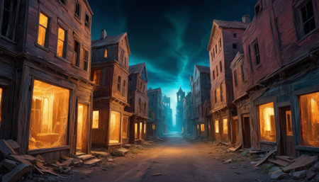 Artistic representation of a deserted town with illuminated windows under a twilight sky, suggesting mystery and untold stories.. AI Generation