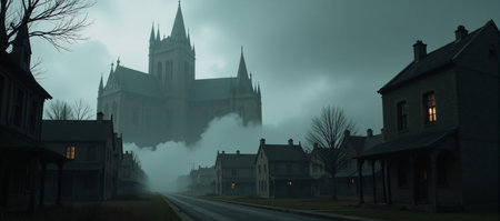 Digital illustration showcasing a mysterious gothic city engulfed by mist evoking an ominous atmosphere