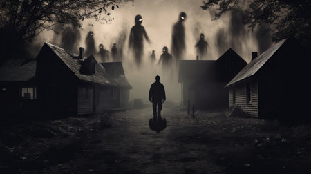 dozens of people walking through a street as mysterious ghost-like forms appear in the background. this captivating photo, in the style of rural life depictions, captures the essence of suburban ennui. the dark black and gray tones, made of mist, add to the intrigue of these natural phenomena. mike campau skillfully captures this haunting scene. ai generated