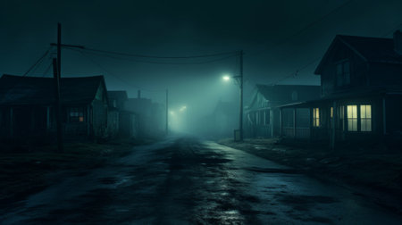 A deserted rural town under a misty night sky, illuminated by street lamps casting eerie shadows.