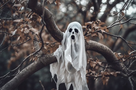 A ghost figure made of cloth with a woman in black attracts for a halloween theme