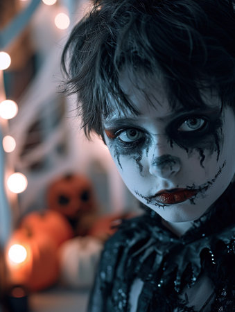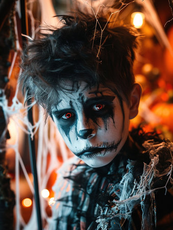 Halloween. Portrait of a boy in the image of a scary zombie on a background of Halloween decorations.