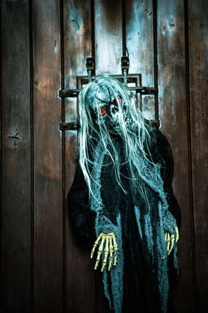Terrible monster at the entrance to the family home. Scenery for Halloween in October. Decoration in the yard.