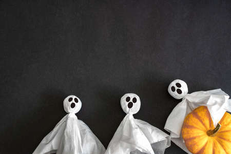 Two ghosts. pumpkin on black background, top view. Copy space. Halloween Concept.