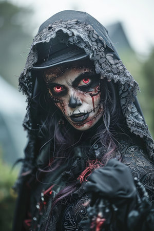 Mysterious Gothic Woman with Skull Makeup and Red Eyes in a Creepy Forest, Fantasy and Horror Conceptual Portrait AI Generative