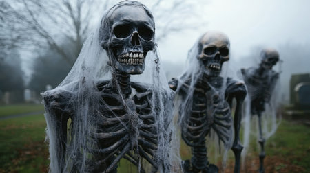 Halloween skeletons draped in cobwebs hanging from tree branches in a foggy cemetery