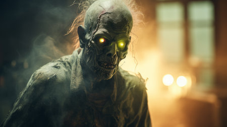 a zombie with glowing eyes is captured in a close-up shot, standing in front of a room emitting a mysterious glow. this captivating image, reminiscent of the style of canon eos 5d mark iv, showcases the artistic techniques of guillem h pongiluppi, including depth of field and solarizing effects. the intensity of the close-up adds to the eerie atmosphere, while the work of wojciech siudmak