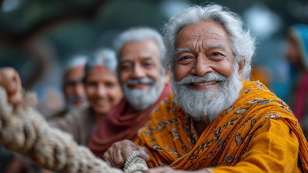 In a charming village in India, a group of elderly Muslim men engage in lively conversation, sharing stories and wisdom as the sun sets, casting a warm glow around them.