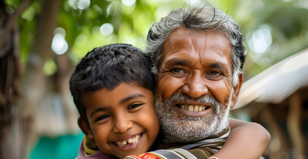 A joyful Indian family with a grandfather, father, and children wearing traditional clothes, smiling together in a cozy setting.
