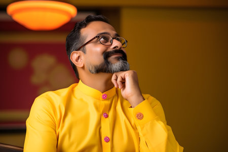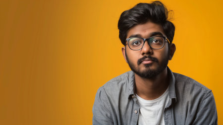 Portrait of a pensive indian man wearing yellow shirt and glasses