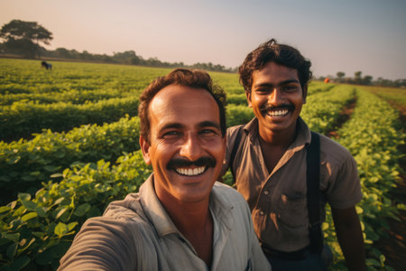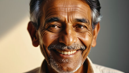 A middle-aged man from India exhibits a warm smile, reflecting contentment and peace. With a backdrop of soft colors, he seems to embrace the calmness of his surroundings.