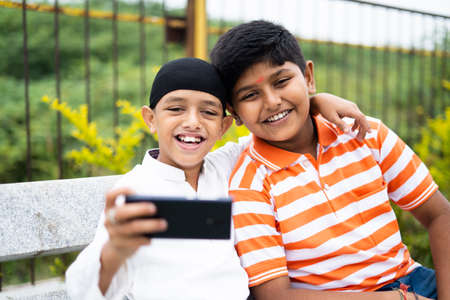 Two happy multiethnic kids taking selfie on mobile phone at park - concpet of friendship, religious diversity and social Harmony