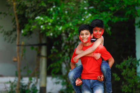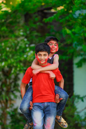 Cute indian little child’s group playing holi. Holi is colors festival in india