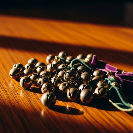 This stunning close-up showcases shimmering gold sequins and delicate bells, creating a luxurious and festive appearance ideal for celebrations and artistic projects.