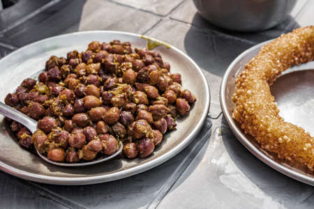 Nepalese food breakfast with Sel Roti and chickpeas. Ring Road in Kathmandu, Nepal.