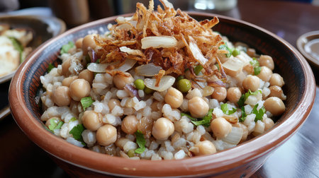 A vibrant bowl of pearl barley mixed with chickpeas and green peas, topped with crispy fried onions. Ideal for a wholesome, nutritious dish.