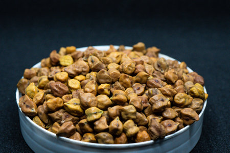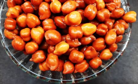 Crispy roasted chickpeas. Indian style dish over black stone background with free text space. Vegetarian vegan food concept. Top view, flat lay
