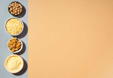 Raw and cooked chickpeas, chickpea flour and flakes in small ceramic plates, diagonal beige and blue background. Vegetarian dish. style minimalism. healthy vegetarian food concept, protein food
