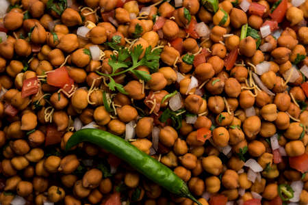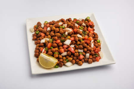 Black Chickpea Chaat or Kala Chana Chat recipe is a popular snack recipe from India, served in a bowl. selective focus