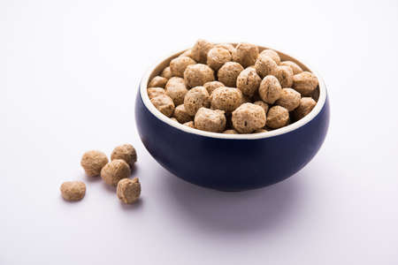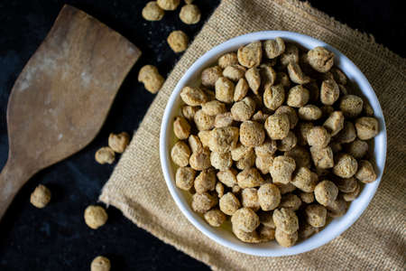 Raw Soya Chunks, Soy Meat for vegans isolated on colourful background in a bowl or in heap form