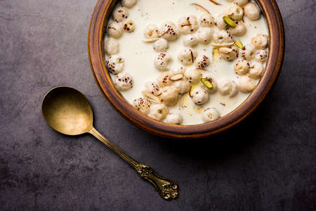 Makhana Kheer - Tasty Indian sweet made using Roasted foxnuts or puffed lotus seeds or makhane, milk and sugar