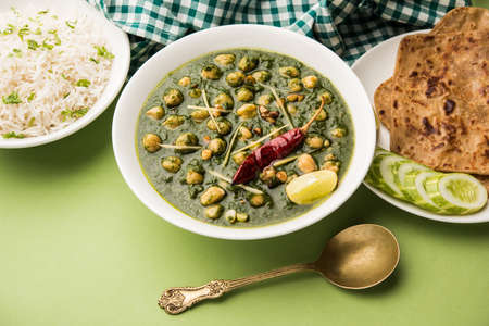 chickpea Spinach Curry or Chana Masala with Palak served with Rice and flatbread or Paratha, selective focus