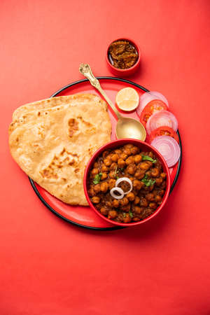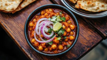A vibrant bowl of chole bhature, featuring spiced chickpeas and fluffy deep-fried bread, presented with onion slices and chutney