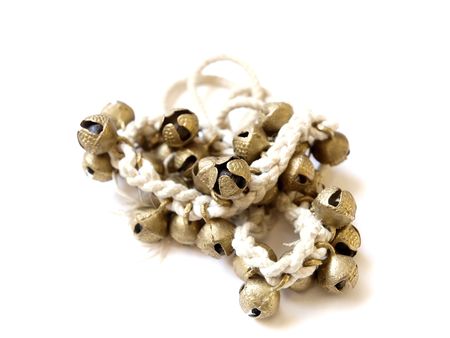 Antique string of tarnished gold bells hanging on a heavy, braided red velvet cord, illuminated by h