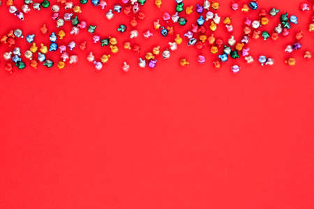 Little christmas colourful jingle bells on red background with copy space for text. Holiday festive happy new year concept. Idea for greeting postcard, poster, banner. Flatlay