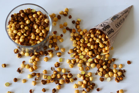 Crispy Roasted Channa chickpeas in a glass and in newspaper cone, scattered on white background
