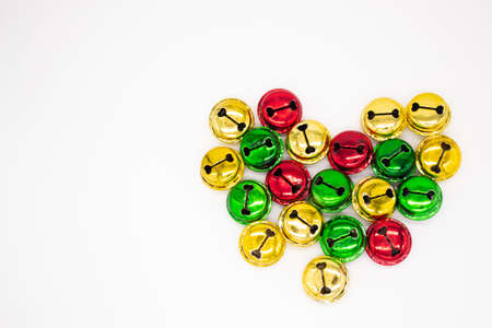 Colorful ringing Christmas bells in gold, red and green. In shape of heart with copy space. The concept of Christmas. Holiday background.