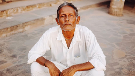 In a charming village in India, a group of elderly Muslim men engage in lively conversation, sharing stories and wisdom as the sun sets, casting a warm glow around them.