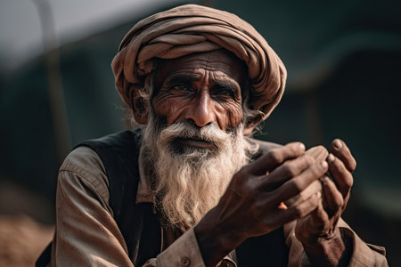 An elderly man from Afghanistan showcases his weathered face, reflecting years of wisdom and resilience against a modest backdrop of nature, embodying the rich culture of his homeland. Generative AI.
