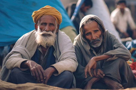 In a village in India, a group of elderly Muslim men engage in animated conversations, exchanging stories and wisdom amidst a colorful ambiance that defines their rustic community.