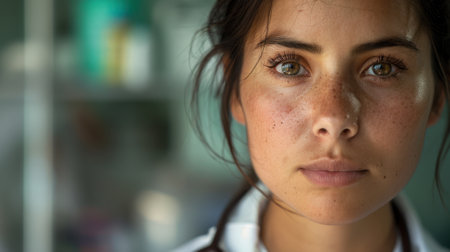 Close-up portrait of a young Mapuche female doctor in a clinic.