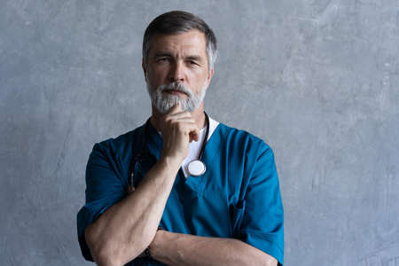 Portrait of professional mature surgeon looking at camera while standing against the grey background.