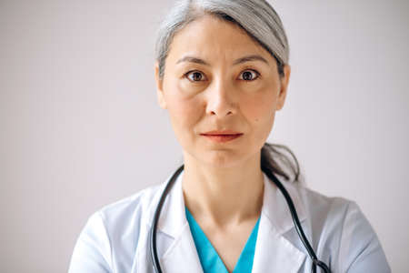 Close-up portrait of asian gray-haired female doctor, general practitioner or pediatrician in medical uniform and stethoscope, standing against isolated background and looking directly at the camera