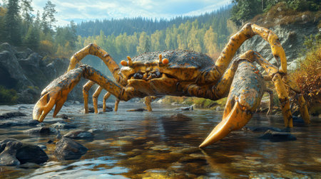 A large, vividly colored crab navigates through a serene river surrounded by autumn foliage and towering trees, capturing the peaceful essence of nature in mid-day light.