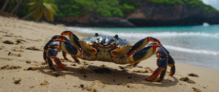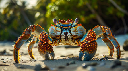Vibrant crab stands guard on a sandy shore with tropical foliage in the background