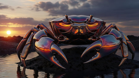 A polished metallic crab sculpture is depicted outdoors near water during sunset. The image displays a high level of detail, with reflective surfaces and warm, contrasting colors. The scene utilizes a wide-angle composition with a focus on lighting, potentially suitable for digital art, design projects, and visual storytelling.