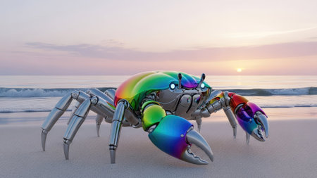 A robotic crab with a colorful shell stands on a sandy beach. The image features a vibrant rainbow design on the crab, contrasting with its metallic body. The composition showcases soft lighting from a sunset, creating an environment that could be suitable for digital art, commercial projects, and advertising purposes.