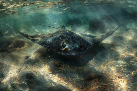 Stingray swimming in the sea, close-up view.