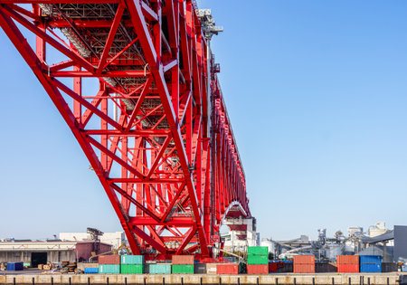 Red Steel Truss Minato Bridge Structure and Shipping Containers at Port Perspective View with Copy Space. Low angle perspective of the red Minato Bridge in Osaka, Japan.
