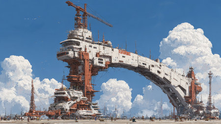 A stunning depiction of a futuristic space dock features a large, intricately designed structure towering against a clear blue sky filled with fluffy clouds.