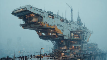This image captures a massive futuristic industrial structure in a foggy urban environment. People and machinery interact to create a dynamic scene filled with intrigue and innovation.